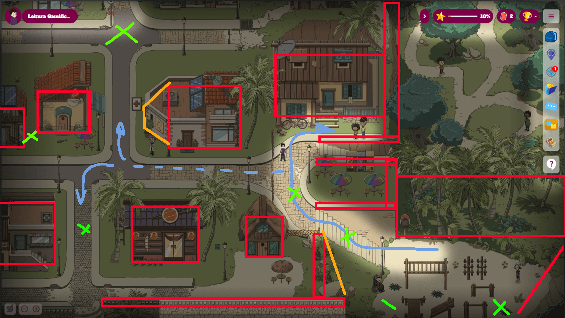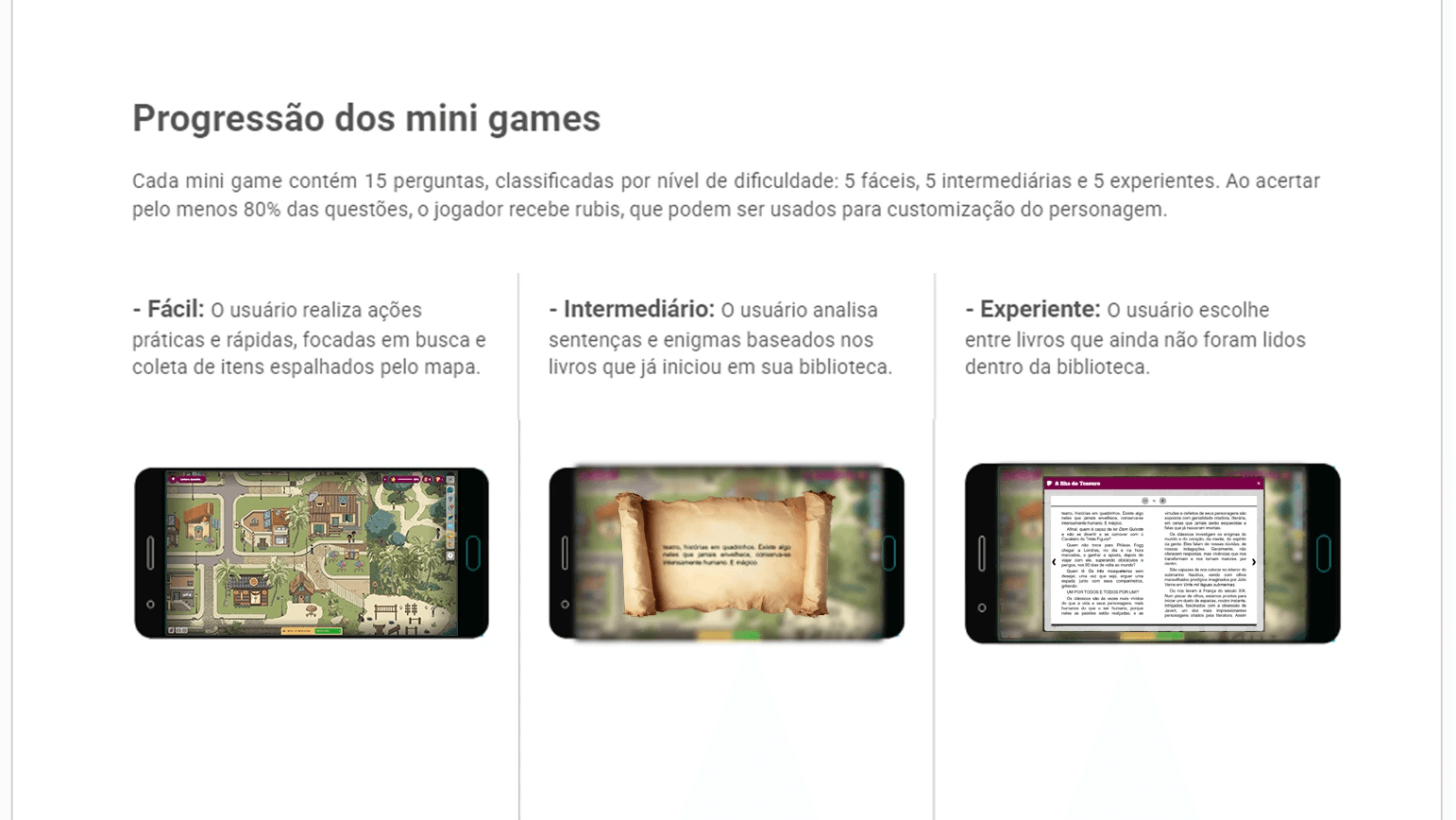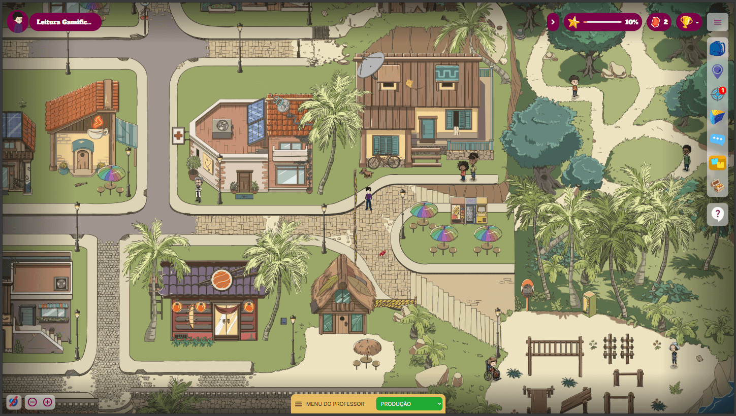 Ao longo da jornada, o progresso acontece por meio de escolhas, interações e conquistas que estimulam o hábito da leitura de forma lúdica e acessível.